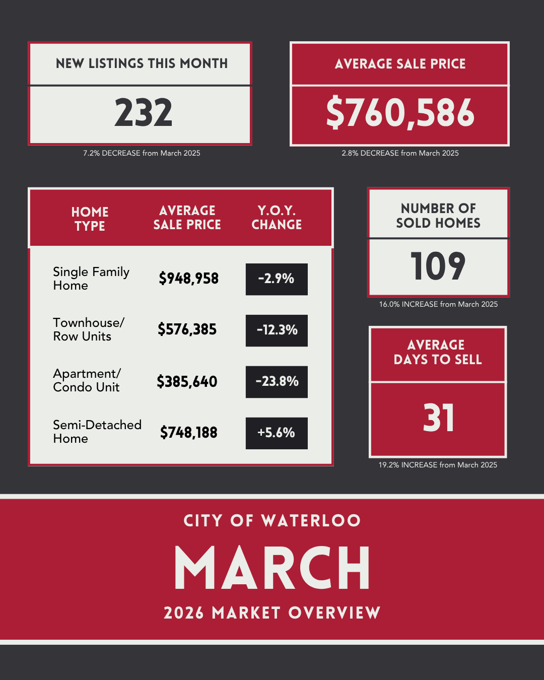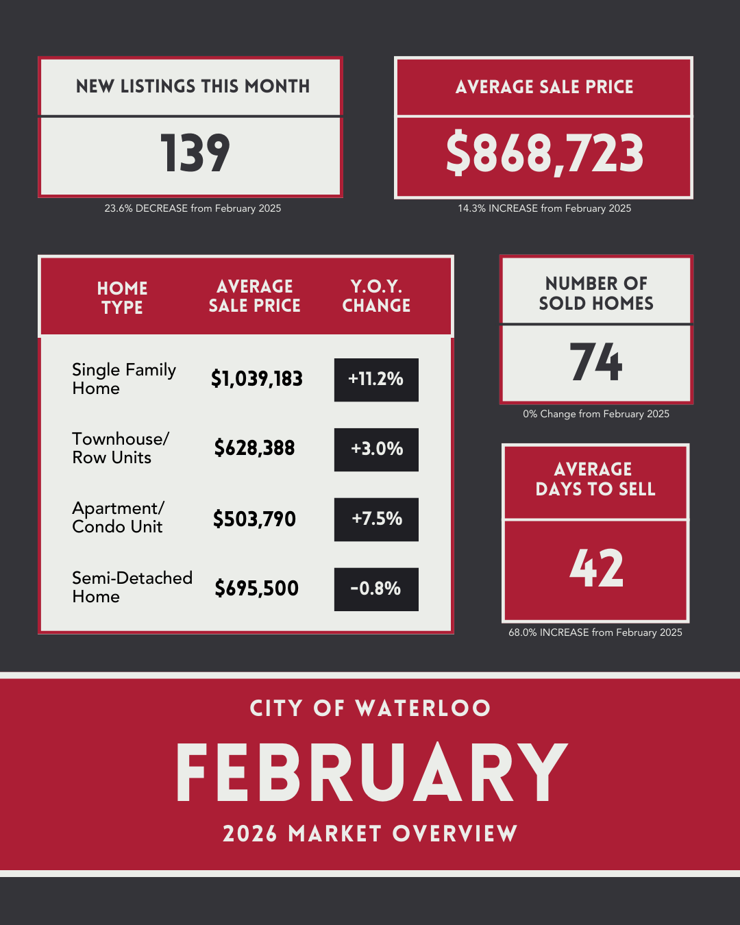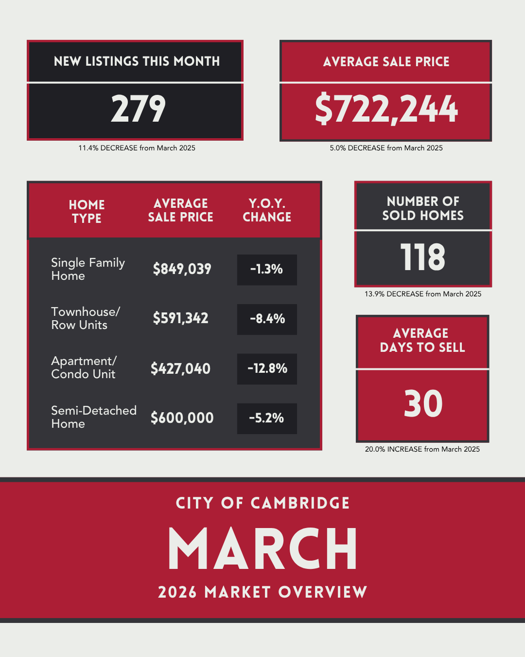 Stay up to date with the latest real estate trends across Cambridge, Kitchener, Waterloo, Guelph, and Centre Wellington with a quick look at the current market stats.